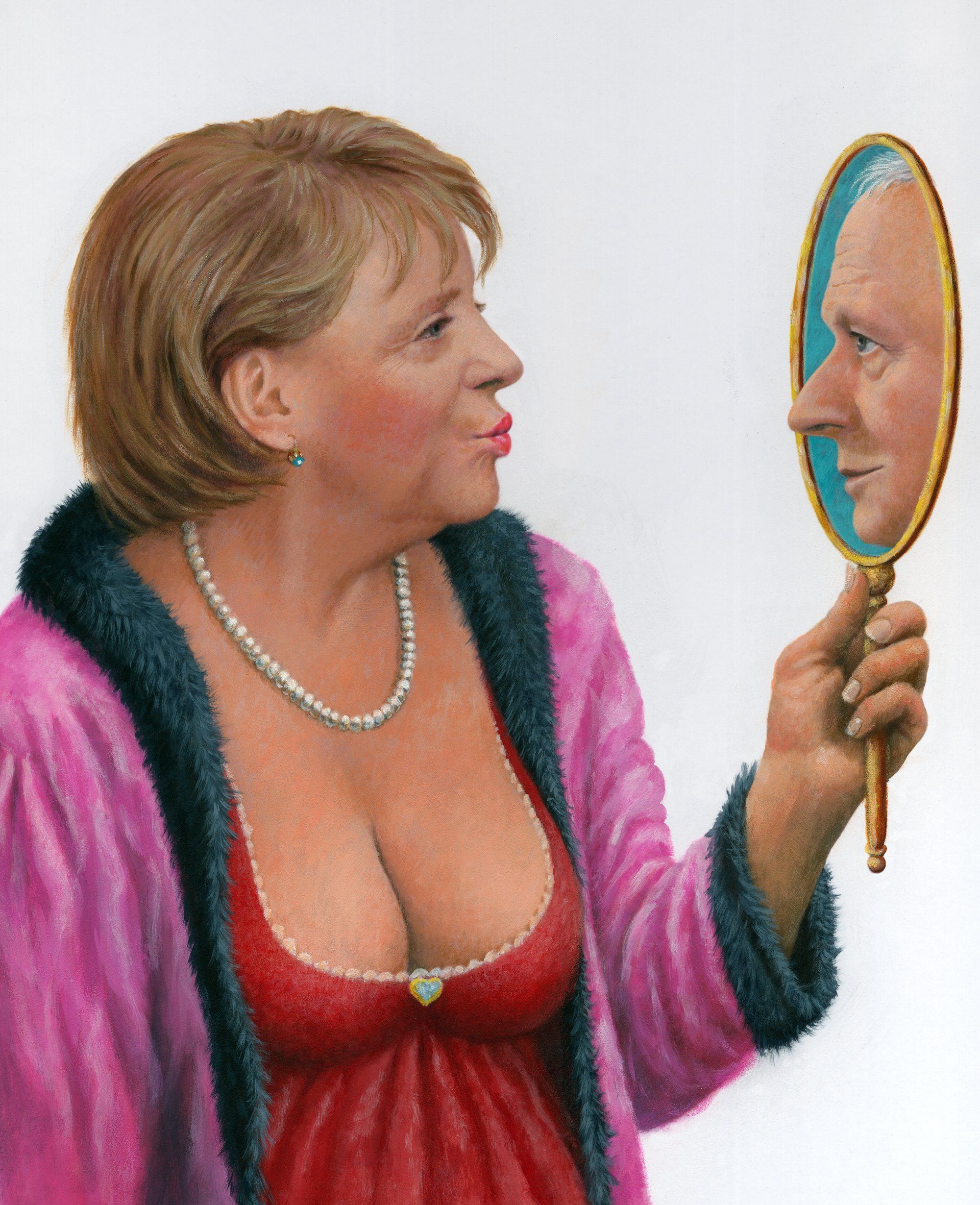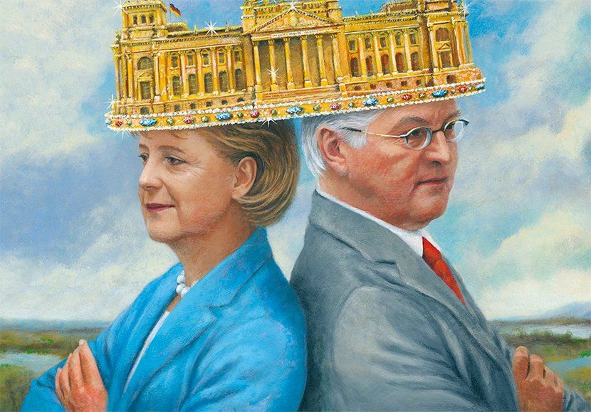 Angela Merkel, Frank-Walter Steinmeier unterm Reichstagsgebäude / Titelillustration für DIE ZEIT / Acrylmalerei